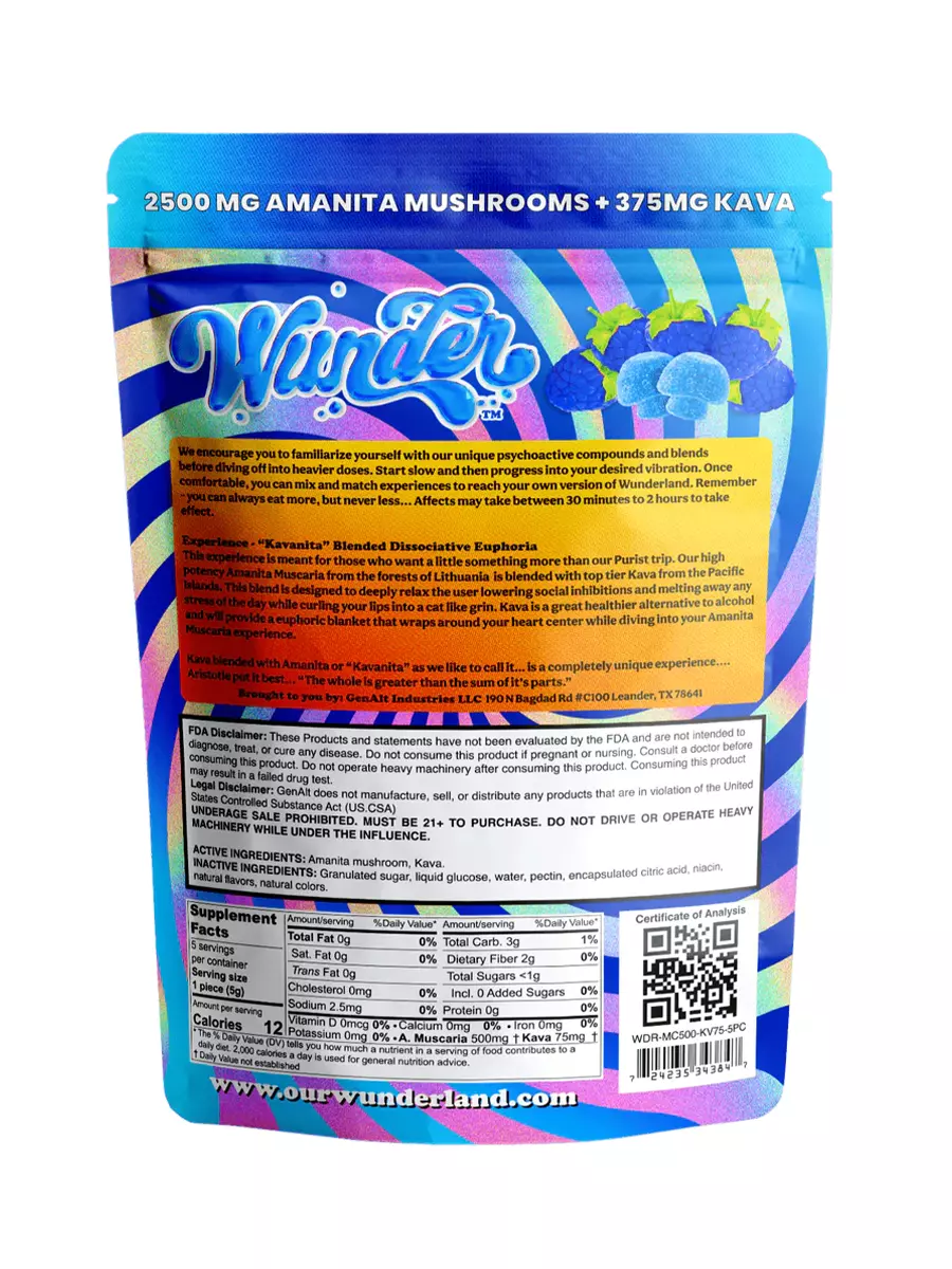 Potent Blend: Each 5ct resealable bag of Blue Razz Wunder’s Amanita Muscaria + Kava Gummies boasts a powerful blend of 2500mg of Amanita Muscaria and 375mg of Kava. Indulge in the symphony of natural effects delivered by each gummy, containing 500mg of Amanita Muscaria and 75mg of Kava.