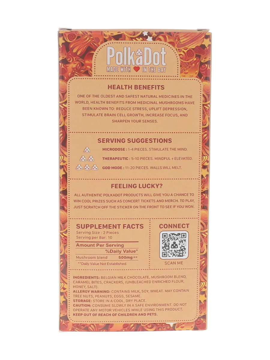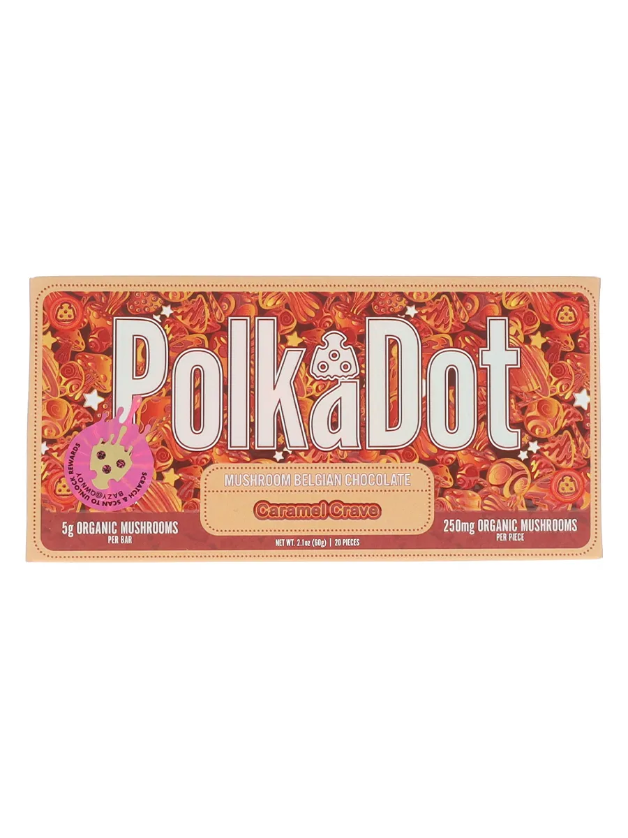 Satisfy your sweet tooth with the luscious combination of buttery caramel and smooth Belgian milk chocolate in Caramel Crave PolkaDot. Each piece contains 250mg of organic mushrooms. The bar offers a serving size of 2 pieces, with 10 servings per bar, making it easy to manage your dosage for the desired effect.​