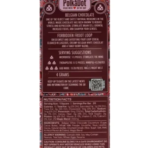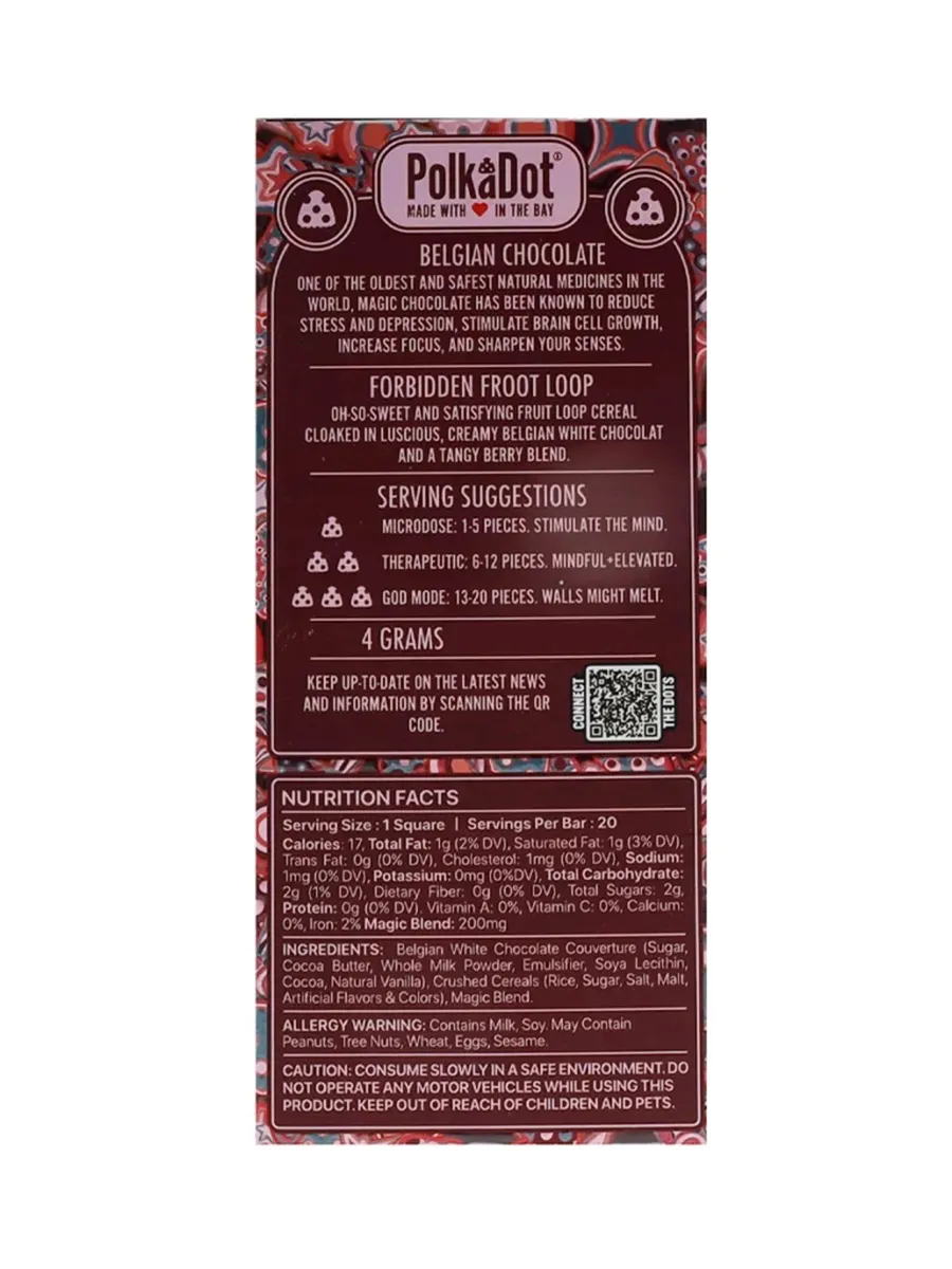Indulge in a nostalgic trip with Forbidden Froot Loop PolkaDot Mushroom Belgian White Chocolate 200mg Per Piece. Experience the playful crunch of fruity froot loops perfectly intertwined with the creamy decadence of Belgian white chocolate. Each bite evokes carefree childhood memories while delivering a whimsical flavor trip. Infused with 200mg of mushrooms, it combines indulgence and creativity for a truly enchanting experience.