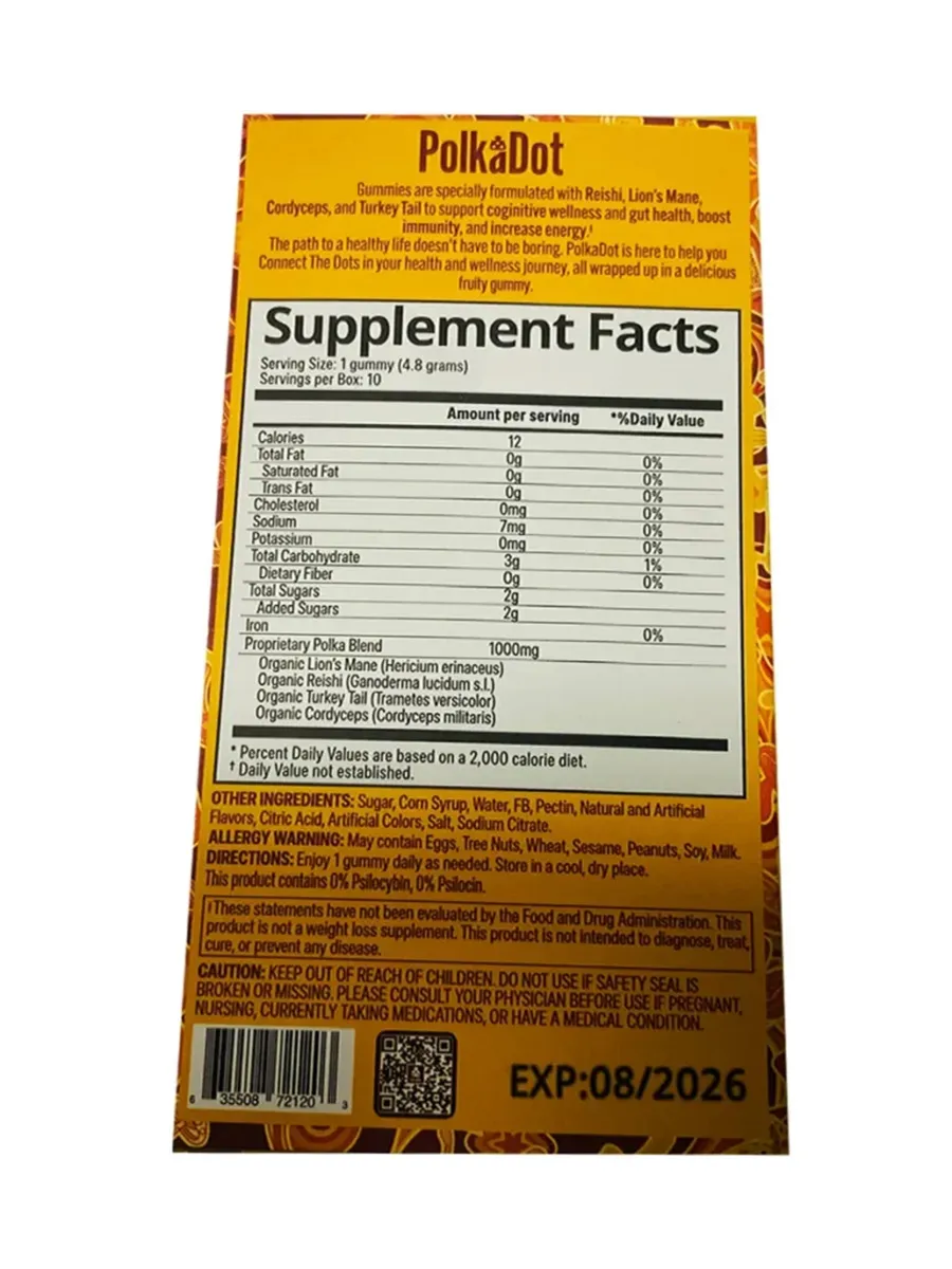 Serving Suggestions: Whether you’re seeking a subtle boost, therapeutic benefits, or a transcendent experience, Mango Sorbet PolkaDot Belgian Shroom Blend Gummies offer versatile serving options to suit your needs. Follow the serving suggestions to customize your experience and achieve your desired effects.