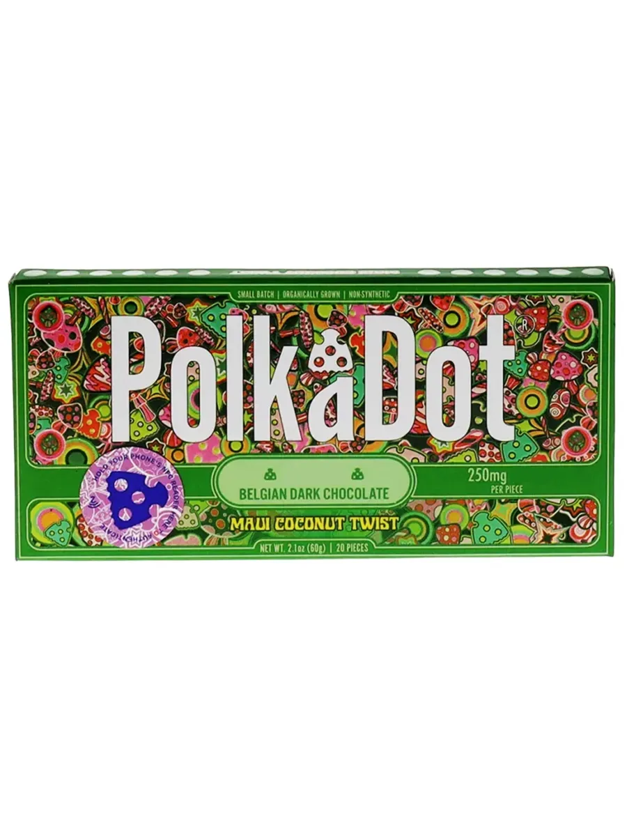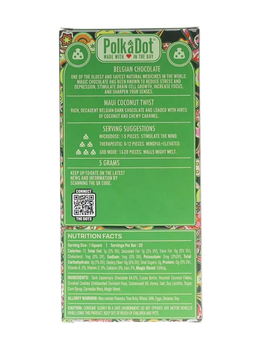 Take a trip to the tropics with this decadent Belgian dark chocolate infused with creamy coconut and exotic island flavors. The bold richness of dark chocolate perfectly complements the smooth, nutty sweetness of coconut, creating a luxurious and indulgent treat. Infused with 250mg of mushrooms, Maui Coconut Twist PolkaDot Mushroom Belgian Dark Chocolate offers a euphoric and balanced experience. Whether you’re seeking relaxation or a heightened sensory experience, this tropical delight is the perfect way to transport yourself to paradise.