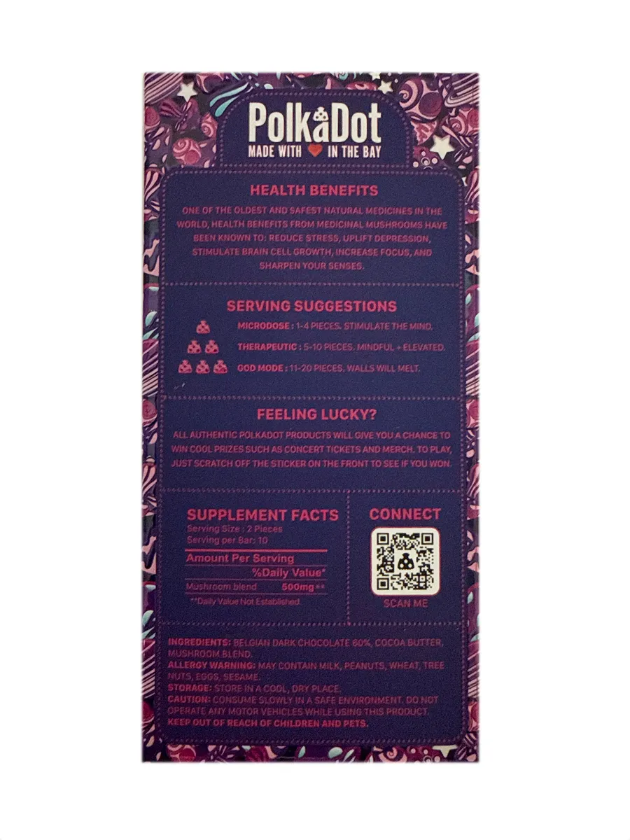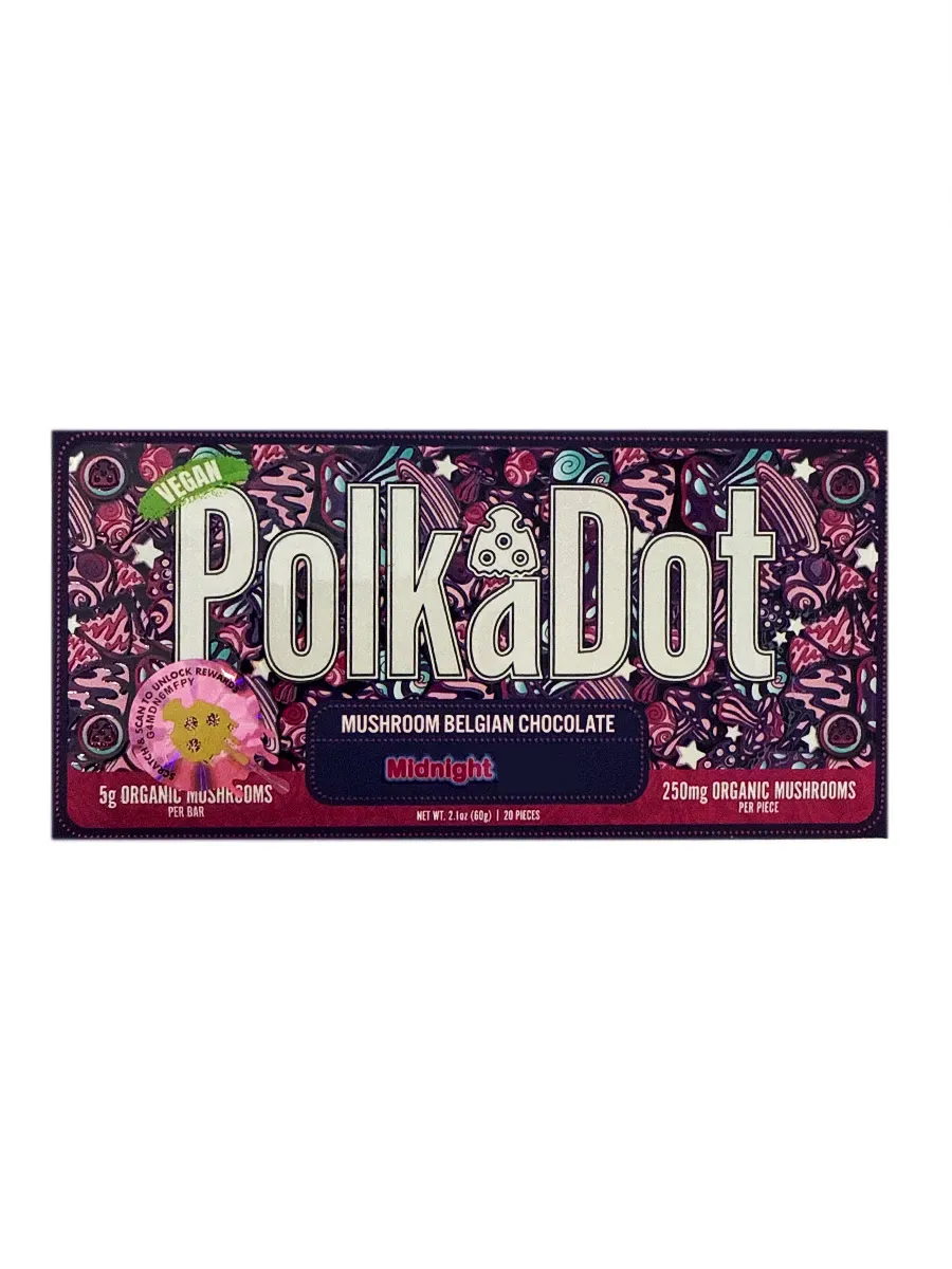 Grab Midnight PolkaDot Dark Chocolate from Eat Mushroom Chocolate for a bold dark twist.