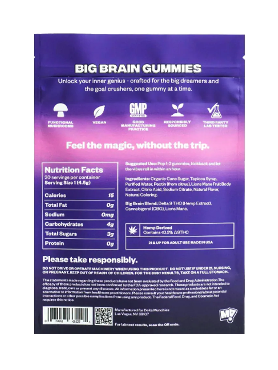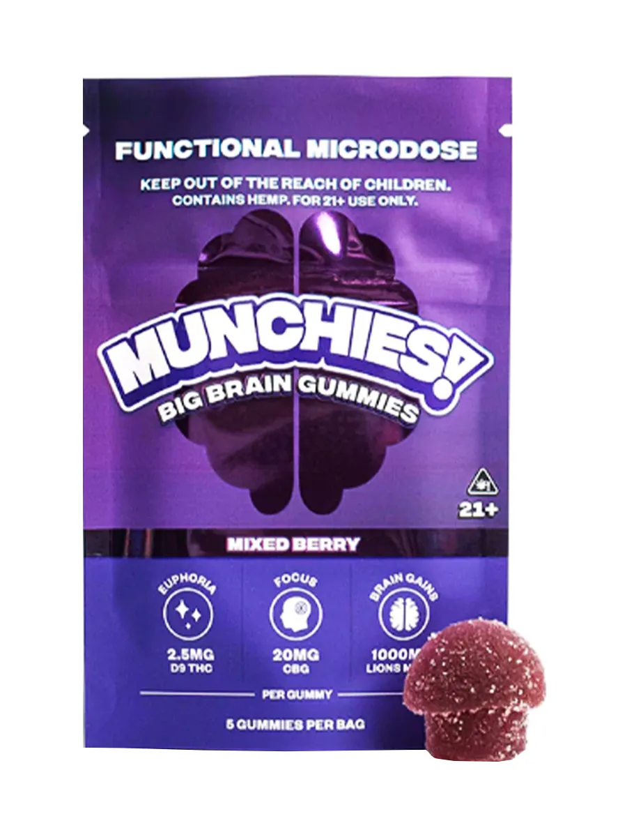 Stay sharp, clear, and in the zone. Munchies Mixed Berry Big Brain Gummies are designed to fuel creativity, focus, and mental stamina. With a microdose of Delta 9 THC, a boost of CBG, and brain-supporting lion’s mane mushrooms, this blend helps you power through your busy day with ease.