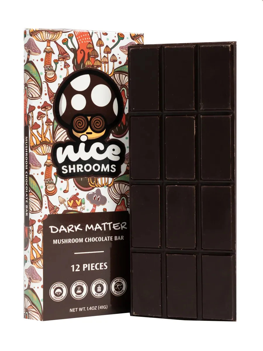 Nice Shrooms Dark Matter Mushroom Chocolate Bar is a premium, lab-tested treat featuring 12 decadent dark chocolate pieces infused with high-quality mushrooms. Designed for a smooth, euphoric experience, it’s gluten-free, non-GMO, and perfect for relaxation or creative exploration.