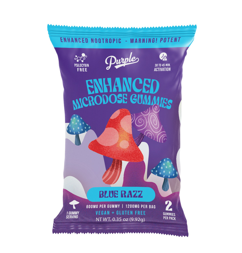 Indulge in Purple Amanita Mushroom Enhanced Microdose Gummies—Blue Razz, infused with KSM-66 Ashwagandha, L-Theanine, Proprietary Mushroom Blend & Nootropics, and Guarana. Fuel your day with Purple Organics Blue Razz gummies, designed to promote calmness, mental focus, and an energy boost.