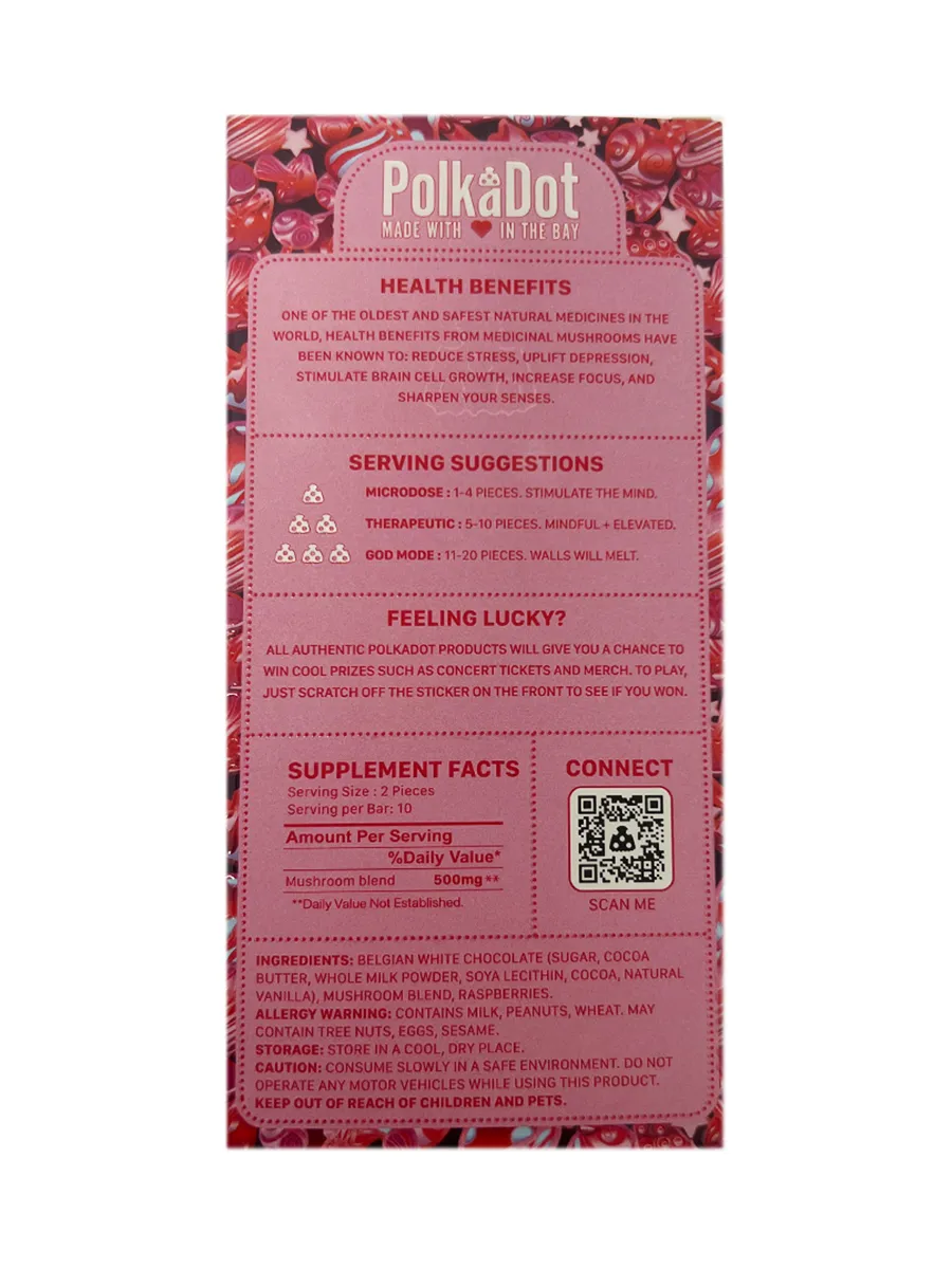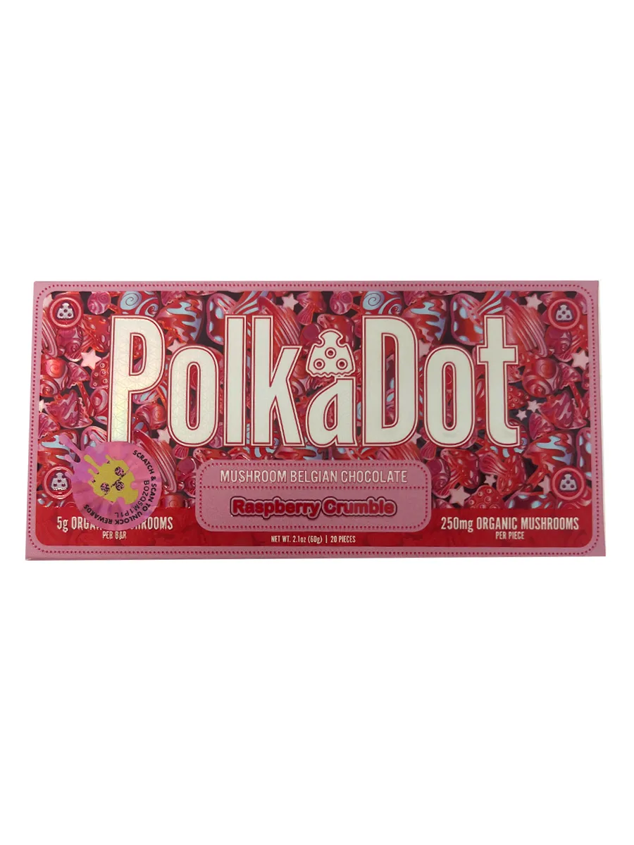 Sweet and smooth, the Raspberry Crumble PolkaDot bar offers a mix of creamy Belgian white chocolate and tart raspberry flavor. Each piece contains 250mg of organic mushrooms, making it easy to portion and control your experience. With ten servings per bar and two pieces per serving, you get both great taste and steady effects. The flavor is soft, fruity, and slightly tangy, ideal for those who enjoy a sweet, calming experience with a mild, balanced edge.