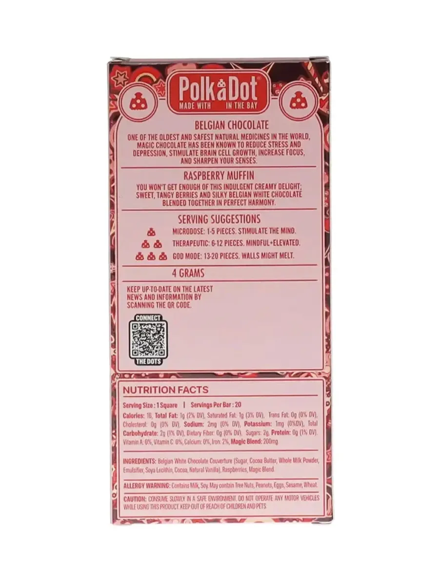 Decadent Flavor: Savor the sweet and tangy fusion of ripe raspberry with the comforting flavor of a muffin, all enveloped in creamy Belgian white chocolate.