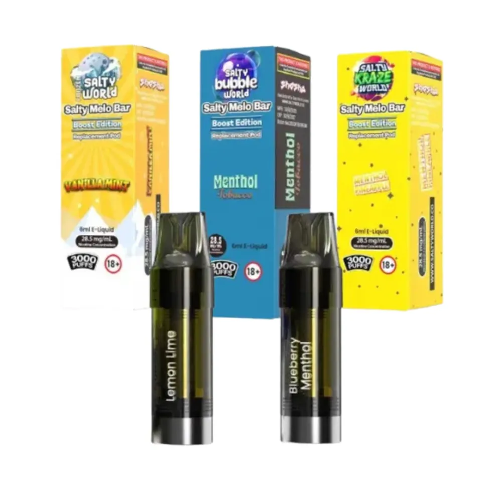 The pre-filled Salty Melo Bar Replacement Pod is designed to be used with the Salty Melo Bar Battery.