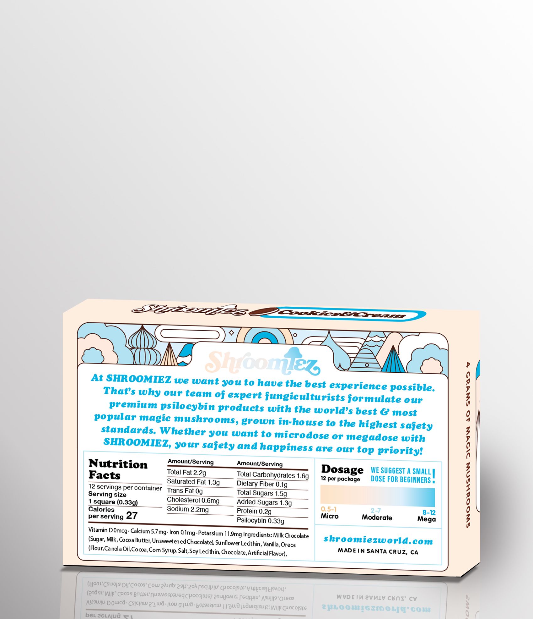 Revel in Shroomiez’s latest edition, the cookies & cream mushroom chocolate bar. Cookies with cream were crumbled and sprinkled into our original milk chocolate bar for our newest mushroom bar—Cookies & Cream! There’s nothing like milk and cookies to take the edge off or maybe even to take a little trip.