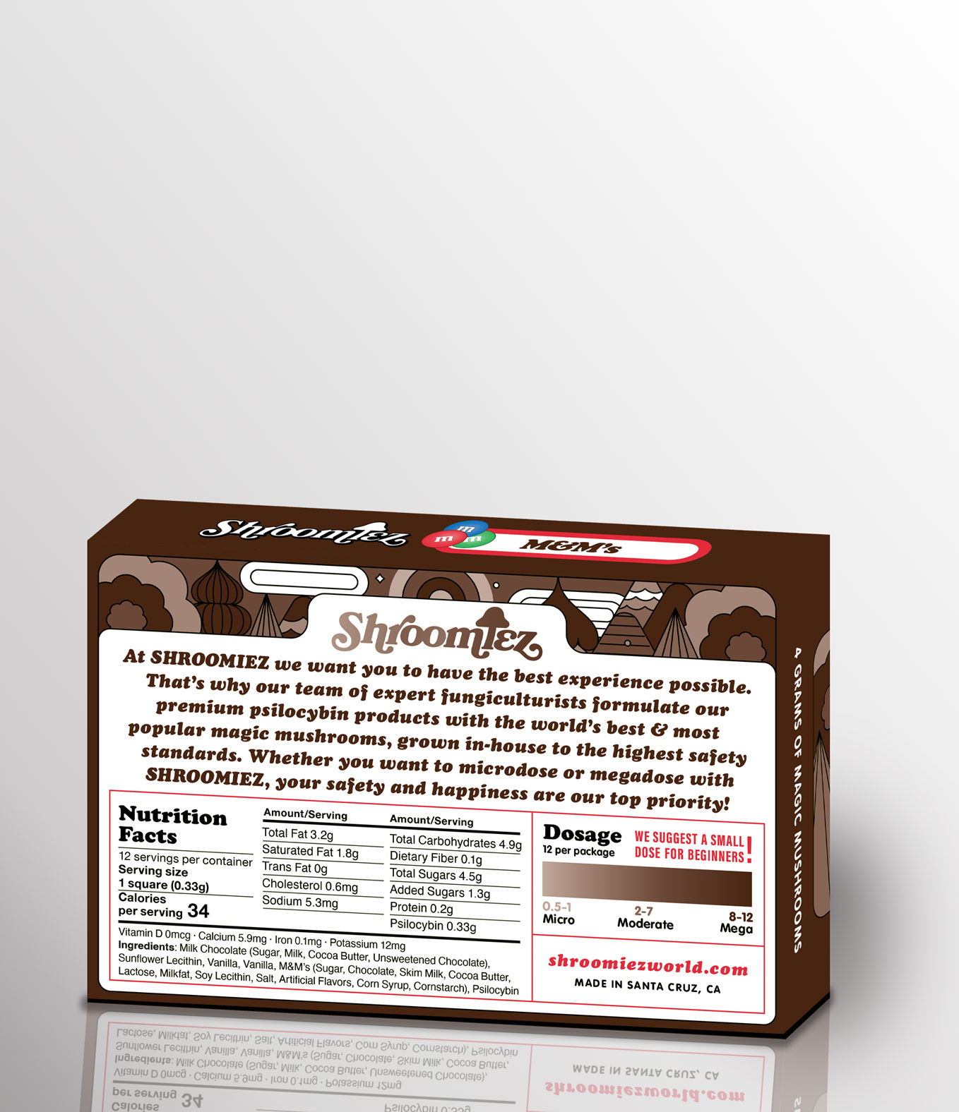 Milk Chocolate (Sugar, Milk, Cocoa Butter, Unsweetened Chocolate), Sunflower Lecithin, Vanilla, M&M’s (Sugar, Chocolate, Skim Milk, Cocoa Butter, Lactose, Milkfat, Soy Lecithin, Salt, Artificial Flavors, Corn Syrup, Cornstarch), and proprietary Psilocybin blend.