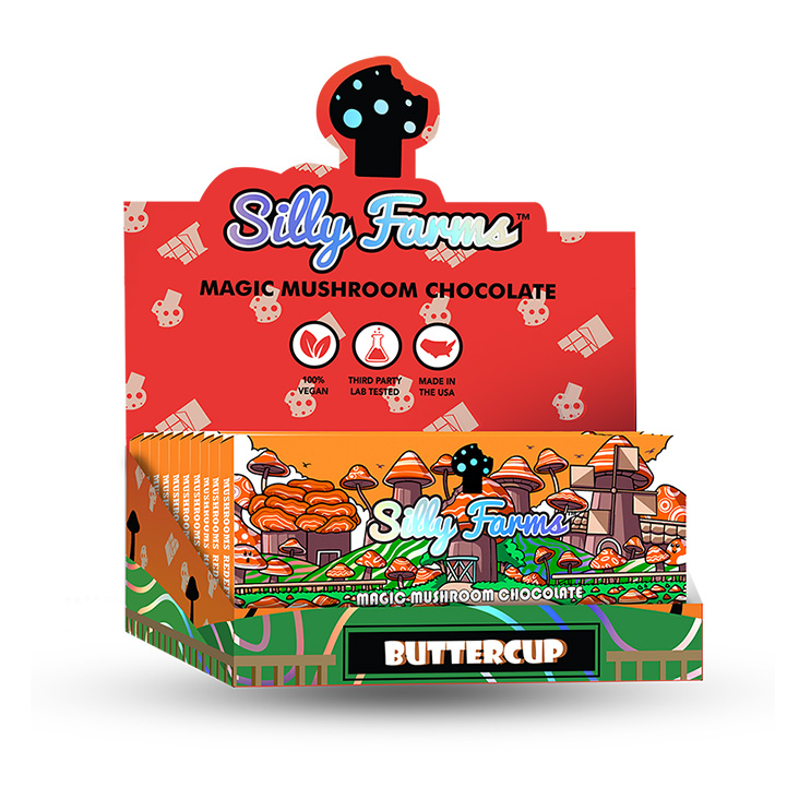 Indulge in Silly Farms BUTTERCUP, a gourmet chocolate masterpiece inspired by the classic Reese’s Peanut Butter Cups. This luxurious creation marries the deep, satisfying flavors of rich peanut butter with the smooth, velvety embrace of premium chocolate, all while incorporating the mystical essence of Amanita Muscaria.