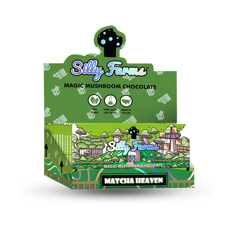 Silly Farms proudly introduces MATCHA HEAVEN, a sublime chocolate bar creation for those who seek tranquility and depth in every bite. This exquisite offering combines the delicate, earthy notes of premium matcha green tea with the creamy luxury of white chocolate, all harmoniously infused with the mystical essence of Amanita Muscaria muscimol extract.