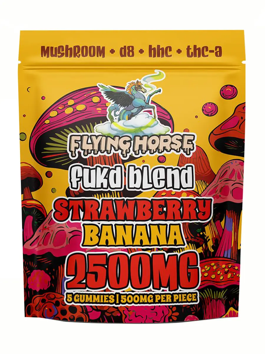 Flying Horse Fukd Blend Gummies in Strawberry Banana flavor offer a potent mix of Delta-8, HHC, THC-A, and shrooms, delivering a balanced and powerful experience. Each gummy provides 500mg of these active ingredients, making them perfect for those seeking high-quality effects. Enhance your experience with Flying Horse Fukd Blend Gummies. Enjoy fast shipping and exceptional customer service.