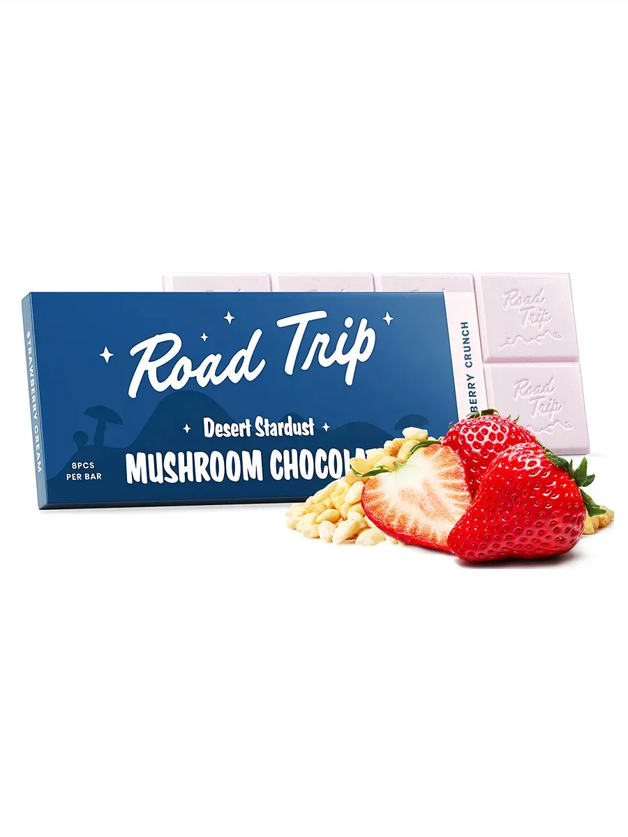 Order your Strawberry Crunch Road Trip Desert Stardust Bar today at Eat Mushroom Chocolate and experience a sweet, mindful treat.
