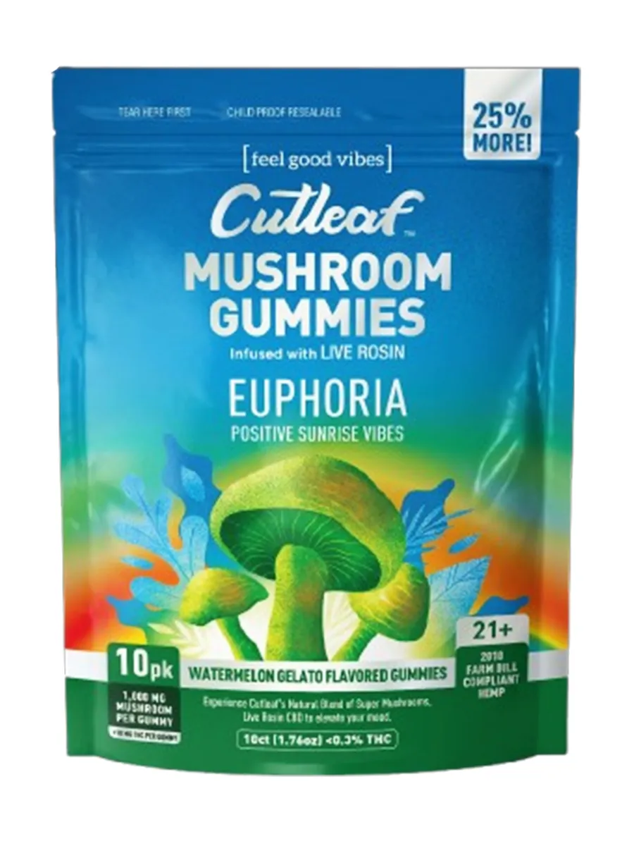 Elevate your mood with the delicious combination of fruity and creamy flavors in the Watermelon Gelato Cutleaf Euphoria Mushroom Gummies 1000mg 10ct.
