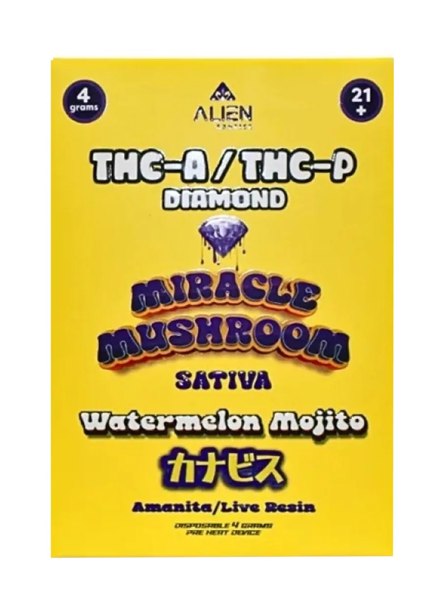 Introducing the Watermelon Mojito Alien Exotics Miracle Mushroom Disposable Vape, a perfect blend of tropical flair and profound effects. Preloaded with 4g of THC-A, THC-P, and Miracle Mushroom, this disposable vape offers a unique combination that ensures both a deliciously refreshing watermelon mojito flavor and a deeply euphoric and relaxing experience.
